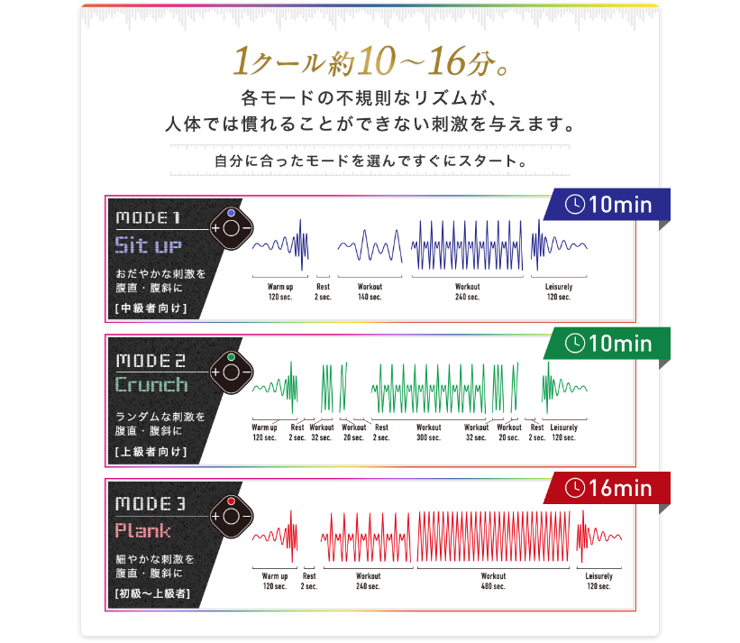 特徴はEMSのリズム。体が予測できないリズム「ポリリズム」で刺激することで、体が慣れてしまわないというメリットがあるそうです。初心者や中級者、上級者とさまざまなモードがあり自分に合ったリズムが選べます。