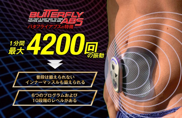 バタフライアブスはその名の通り、蝶々の形が特徴的なEMSマシンです。小さいサイズだから、テレビを見ながら、買い物をしながら、料理をしながらと、いつでもどこでも、“ながら腹筋”ができます。