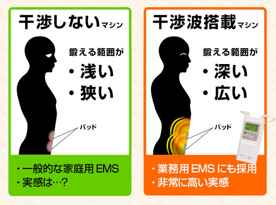 パーフェクト4500HOTの特徴は「干渉波」。干渉波EMSは深く、広く、強力に筋肉を刺激することが可能。そのためパーフェクト4500HOTをつけると、お腹のなかからしっかりと動いていることを実感できます。