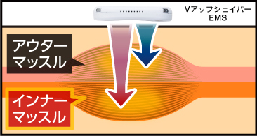 実はほとんどのEMSは低周波しか出ないのでアウターマッスルという外側の筋肉しか動きませんが、VアップシェイパーEMSは、中周波も対応しているのでインナーマッスルにも刺激を与えることができます。